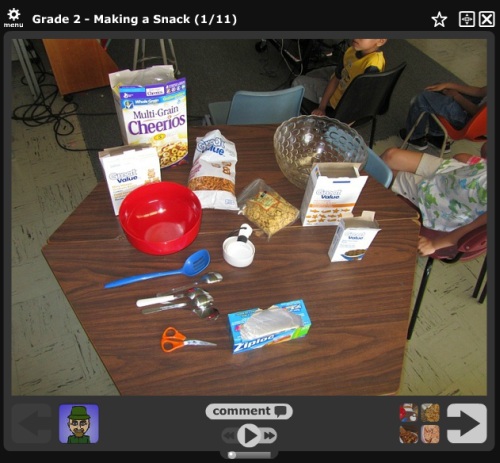 A five minute break took place in the middle of the session. Students put away the snack materials, cleaned up and assembled for the second part of the session: recording voice comments of the steps in making the snack. Also at this time, the teacher uploaded eleven pictures to a new VoiceThread, added a title and description, and made sure the headset/mic was plugged in and ready to use.